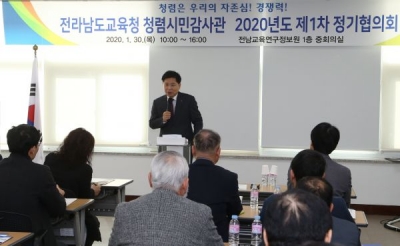 전라남도교육청은 30일 전남교육연구정보원 1층 중회의실에서 청렴시민감사관의 2019년 활동성과를 평가하고 2020년 활동계획을 수립하기 위한 청렴시민감사관 2020년도 제1차 정기협의회를 개최했다.