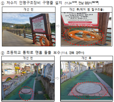심사기준 : 예방 효과성, 파급 효과성, 수용 가능성, 처리기관의 노력도 이번에 선정된 우수 신고는 신호등 및 표지판 파손 등 교통 분야와 도로 위 맨홀 및 배수 불량 등 시설 분야 및 기타 생활 속 상시 위험요인 등 다양한 유형의 신고들이 선정됐다.