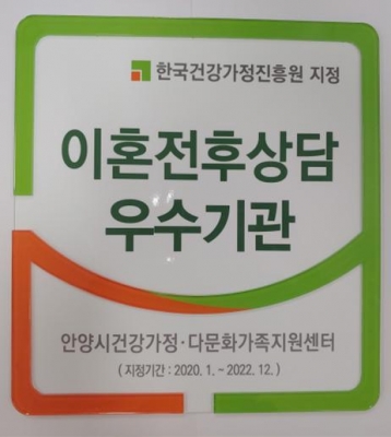 [충청뉴스큐] 안양시 건강가정·다문화가족지원센터가 한국건강가정진흥원에서 실시한 ‘이혼전후상담 우수기관 인증’ 심사에서 우수기관에 선정, 인증현판을 전달받았다고 30일 밝혔다.