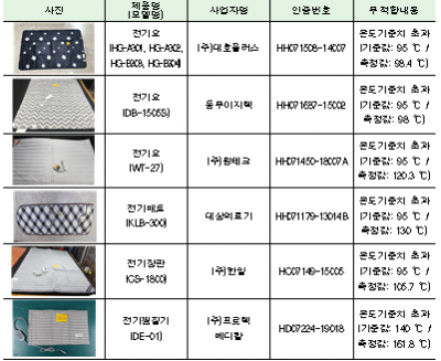또한, 안전기준에는 적합했으나, ‘저온화상에 대한 주의문구’ 누락, ‘정격입력’ 표시 부적합 등 표시사항을 위반한 2개 제품에도 개선조치 권고를 했다.