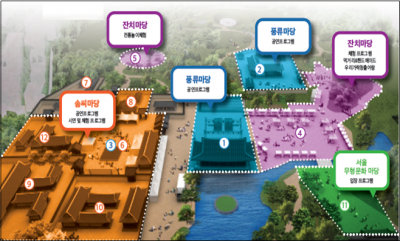 도심 한복판에서 고풍스런 한옥 명소인 남산골한옥마을의 천우각, 서울남산국악당, 전통가옥, 광장 등 전체가 풍류마당, 솜씨마당, 잔치마당, 서울무형문화마당 등으로 나뉘어 축제와 체험의 장이 된다.