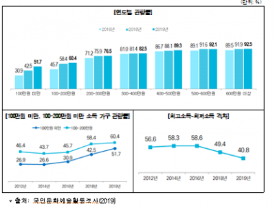 이러한 현상은 기초와 차상위계층을 대상으로 문화, 체육, 관광에 사용할 수 있는 ‘문화누리카드’를 지원하는 ‘통합문화이용권’ 지원 금액이 2016년 1인당 5만원에서 2019년 1인당 8만원까지 매년 1만원씩 인상되고 2018년 7월 1일 도서구입비 및 공연관람비 등 문화비에 대한 소득공제가 도입되면서 저소득층의 문화향유 기회가 확대되어 나타난 것으로 분석된다.