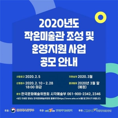 [충청뉴스큐] 문화체육관광부는 한국문화예술위원회, 국민체육진흥공단과 함께 오는 28일까지 ‘2020년 작은미술관 조성 및 운영 지원’ 사업의 대상 기관을 공모한다.