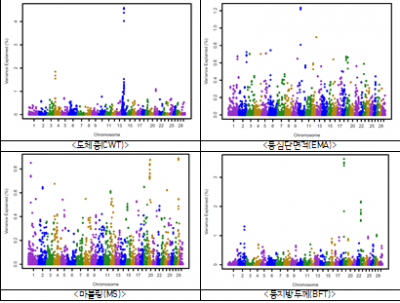 도체중과 등지방두께의 경우, 전체 유전 마커 중 상위 10개가 형질에 기여하는 비중이 약 10%를 차지하는 것으로 확인됐다.