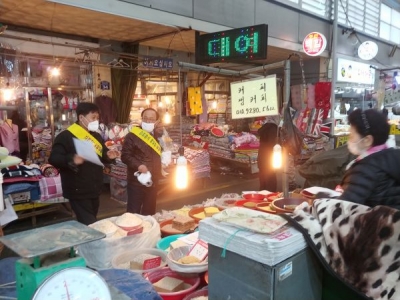 이들은 시장 내 점포 구석구석을 돌아보며 코로나19 예방수칙이 담긴 안내문 5백장과 마스크 1천개를 전달했다.