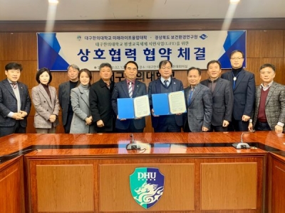 [충청뉴스큐] 경상북도 보건환경연구원은 지난 12일 대구한의대학교 회의실에서 대구한의대학교 미래라이프융합대학과 지역사회 평생교육진흥과 인재양성을 위한 상호협력 협약을 체결했다.