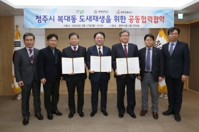 [충청뉴스큐] 청주시가 17일 오전 시청에서 한범덕 청주시장과 김수갑 충북대학교 총장, 이상철 충북개발공사 사장과 `20년도 복대동 도시재생 뉴딜사업 계획의 공동 수립과 성공적인 추진을 위해 공동협력 협약식을 개최했다.