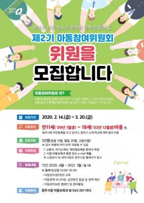 [충청뉴스큐] 청주시가 아동의 권리에 대해 함께 생각하고 아동이 존중받는 지역사회를 함께 만들어 갈 제2기‘청주시 아동참여위원회’위원을 오는 3월 20일까지 모집한다.