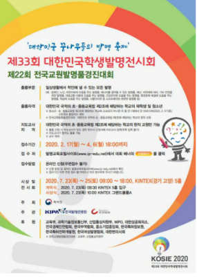 청소년 발명가 프로그램 : 지식재산 창출 및 활용에 대한 교육·컨설팅 등을 통해 미래 사회를 혁신적으로 주도해 나갈 청소년 창업가 육성 프로그램‘제33회 대한민국학생발명전시회’와 관련한 보다 자세한 사항은 발명교육 포털사이트를 통해 알 수 있으며 기타 문의사항은 본 대회를 주관하는 한국발명진흥회 창의발명교육연구실로 문의하면 된다.