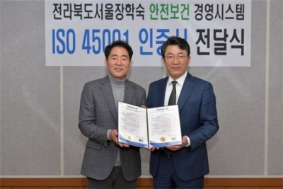 [충청뉴스큐]전라북도인재육성재단산하 서울장학숙은 17일 오전 11시 서울시 방배동 소재 서울장학숙 중회의실에서 안전보건 경영시스템 인증서 전달식을 가졌다.