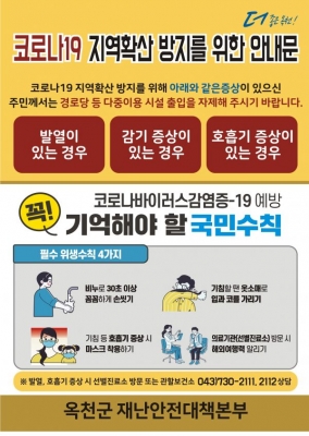 임순혁 보건소장은 “코로나19의 감염 위험을 지역사회 확산을 막기 위해 안내문을 긴급 제작해 부착했다”며 “주민 스스로 예방수칙을 철저히 지켜 건강을 지키는 한편 유사 증상이 발생할 경우 즉시 옥천군보건소로 연락해 주시길 바란다”고 당부했다.