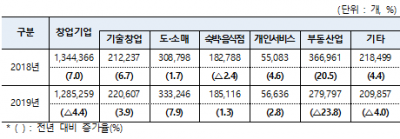 법인창업은 부동산업, 도·소매업, 전문·과학·기술 서비스업 순으로 증가했고 개인창업은 부동산업과 전기·가스·공기공급업이 크게 감소했지만, 법인창업과 개인창업 모두 기술창업은 증가했다.