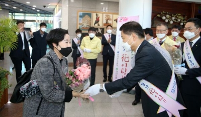 장석웅 교육감을 비롯한 전라남도교육청 간부들과 김석기 본부장 등 농협전남지역본부 관계자들은 6일 오전 도교육청 청사 1층 현관에서 출근하는 여직원 230여명에게 장미꽃다발과 떡을 나눠줬다.