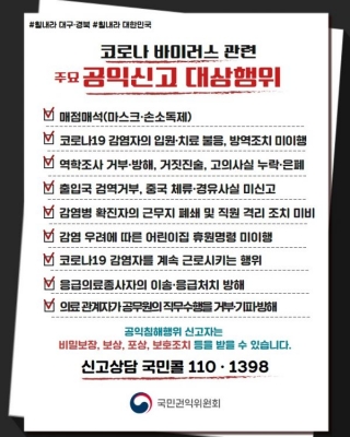 국민권익위원회는 코로나19 감염자 확산을 막기 위해 ‘감염병예방법’, ‘검역법’, ‘의료법’ 등을 위반한 공익신고가 접수되면 신속히 처리하기로 했다.