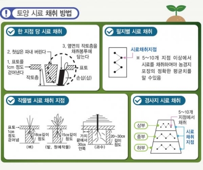 검정받을 토양은 수확 직후 또는 밑거름을 시비하기 1달 전, 모종삽 등을 이용해 표토 1~2cm를 걷어내고 첫 삽은 파내 버린 후 노출 옆면의 작토층을 깊이 15cm까지 고르게 채취하면 된다.