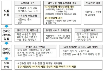 지원사업 참가업체로 선정될 경우 온라인사이트 입점을 위한 제반사항은 물론 현지 홍보 마케팅, 인증취득 등 수출을 위한 다양한 서비스를 받을 수 있으며 소요비용의 80%를 1 기업당 500만원 한도 내에 지원받을 수 있어 체계적인 현지 이커머스 시장 진출뿐만아니라 재정적 부담도 완화할 수 있을 것으로 기대된다.