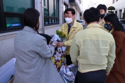 [충청뉴스큐] 영동군이 코로나 19 확산으로 어려움을 겪는 화훼농가를 돕기 위한 소비 촉진 캠페인을 벌였다.