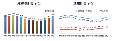 2019년 사교육비 총액은 약 21조 원으로 2018년 19조 5천억원 대비 1.5조 원 증가했다.