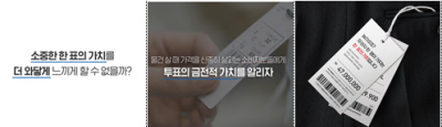 ‘한 표의 가치’캠페인은 투표의 가치를 금액으로 환산해 유권자 한 명이 가지는 한 표의 가치를 체감하게 하고 물건을 구매할 때처럼 신중한 투표권을 행사하자는 의미다.