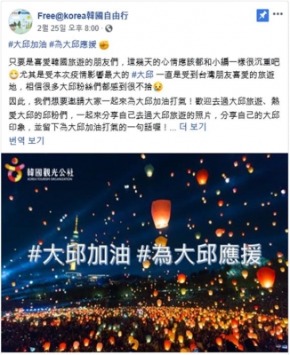 특히 대구방문 외국인 관광객 최대 국가인 대만에서는 한국관광공사 타이베이지사 공식 페이스북의 ‘힘내라 대구 대구를 응원해주세요’ 게시물에 수많은 대만 네티즌들이 응원댓글 릴레이가 이어지고 있다.