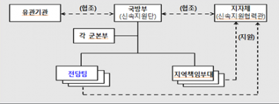 ‘국방신속지원단’은 기존의 다원화된 대민 지원체계를 일원화하고 지원 속도를 높이기 위해 지원팀과 전담부대를 상설화해 가용한 인력과 장비, 물자를 즉각 지원할 수 있도록 지원체계를 개선했다.