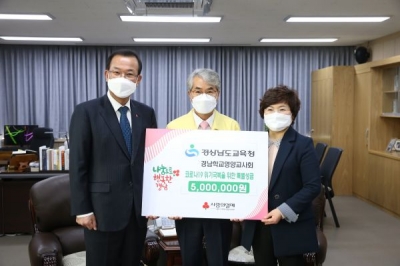 [충청뉴스큐] 경상남도교육청은 12일 코로나19로 인해 현장에서 애쓰는 의료계에 사용해 달라며 경남학교영양교사회가 모금한 500만원을 사회복지공동모금회에 성금으로 기탁했다.