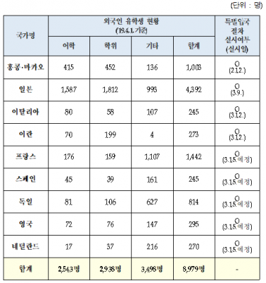 [충청뉴스큐] 교육부는 중국 유학생에게 적용하였던 보호·관리 방안을 특별입국절차를 적용하는 국가로 확대하기로 했다.