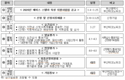 신청대상은 본사가 부산인 창업 3년 이상 7년 이내인 창업기업으로 이 가운데 투자유치형, 성장형, 고용창출형, 수출형, 기술혁신형 등의 요건을 충족해야 하며 요건심사→발표평가→현장평가 등을 거쳐 기업을 선정한다.