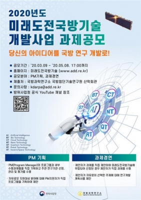 [충청뉴스큐] 방위사업청과 국방과학연구소는 19일부터 ‘2020년 미래도전국방기술개발사업’ 온라인 사업설명회를 방위사업청 유튜브 채널을 통해 진행한다.