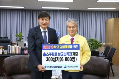 [충청뉴스큐]경상남도교육청은 20일 ㈜무학으로부터 학교 내 코로나19 예방을 위해 알코올 주조원료로 만든 분사형 살균 소독제 6,000병을 기증받았고 밝혔다.