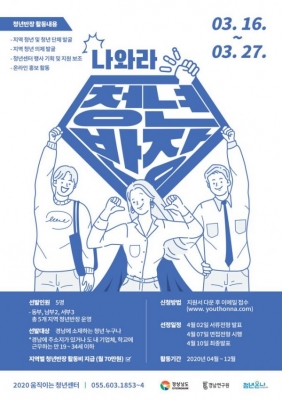 도내 청년정책에 관심이 많은 ‘경남청년’을 대상으로 동남부 2명·서부 3명 등 권역별 총 5개 지역의 청년반장을 선정한다.