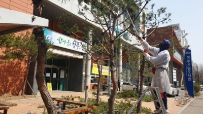 [충청뉴스큐]코로나19 감염 여파로 개관일이 오는 4월 6일로 또 다시 미뤄진 가운데, 서원도서관 인근에 거주중인 시민이 소나무 전정 작업 재능기부에 나서 훈훈함을 주고 있다.