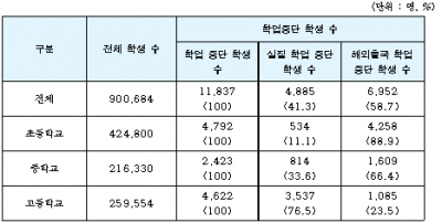 이중에는 질병이나 교내 폭력, 부적응 등의 이유로 학업을 중단하는 경우가 약 38.5%에 달한다.