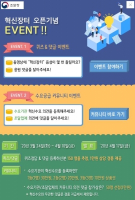 [충청뉴스큐] 조달청은 24일 혁신조달 종합포털‘혁신장터’에서 공공기관, 기업, 일반국민을 대상으로 홍보 이벤트를 실시한다.