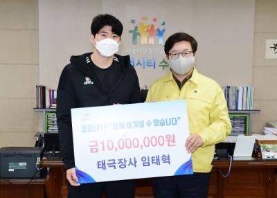[충청뉴스큐] 수원시청 씨름단 소속 임태혁 선수가 24일 오전 11시 염태영 수원시장 집무실에서 “코로나19로 어려움을 겪는 시민들을 위해 써 달라”며 성금 1000만원을 기탁했다.