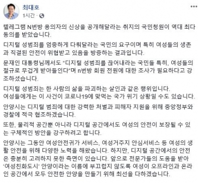 최 시장은 sns에서 n번방 용의자 신상을 공개해달라는 국민청원이 역대 최다인데 이는 디지털 성범죄를 엄중히 다뤄달라는 국민의 요구이며 여성의 안전이 위협받고 있음을 방증하는 결과라고 언급했다.