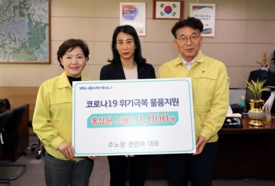 이날 기탁식에서는 광주지역 기업 ‘주노팜’이 코로나19 위기 극복을 지원하기 위해 홍삼드링크 1000개를 전달했다.