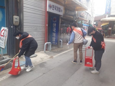이날 활동은 상인회원 등 30여명이 참여한 가운데 상가, 도로변 청소 및 손잡이 소독 등 꼼꼼하게 방역을 진행했다.