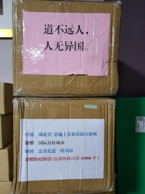 제천시에서는 지난 달 중국 우호교류 도시인 호북성 은시주에 코로나 19로 인한 감염 피해가 심각하다는 소식을 듣고 2천 5백장의 방역마스크를 국제우편 배송 등으로 전달한 바 있다.