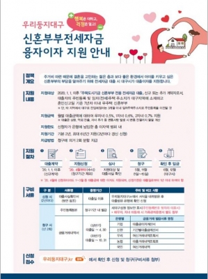 [충청뉴스큐] 대구시는 오는 4월 1일부터 ‘신혼부부 전세자금 대출이자 지원 사업’ 신청을 접수 받는다.