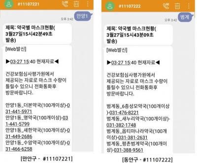 이 서비스는 동안구는‘#11107221’로 만안구는‘#11107222’로 각각 번호를 입력해 문자 전송하면, 1분 이내에 거주지 관할 구 소재 약국의 공적마스크 판매현황을 받아보는 방식이다.