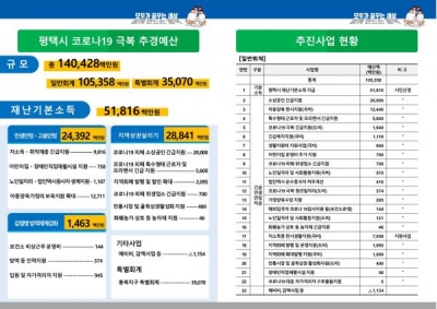 [충청뉴스큐] 평택시는 코로나19로 인한 지역 경제 위기극복을 위해 재난기본소득 518억원을 포함, 1,404억원의추경예산을 편성해 시의회에 제출했다고 밝혔다.