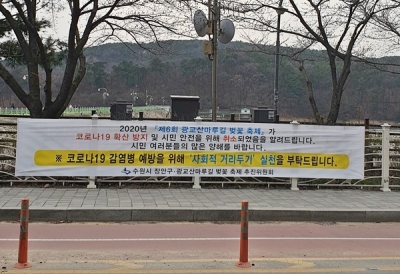 수원시는 광교마루길, 서호천, 만석공원, 황구지천, 장안공원, 화서공원, 여기산공원 등 상춘객 밀집 예상 지역에 현수막을 설치해 4월 상순에 봄꽃을 즐기려는 시민들에게 사회적 거리두기를 상기시킨다.