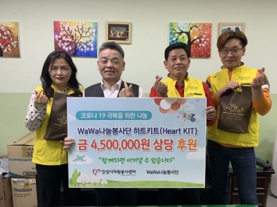[충청뉴스큐] WaWa나눔봉사단은 지난달 31일 450만원 상당의 하트키트 100개를 안성시자원봉사센터에 전달했다.