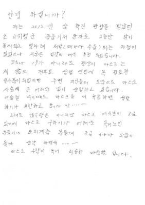 편지의 내용은 본인을 암 확진 받은 초 고위험군 중중 기저질환자라 밝히며 코로나19가 아니어도 항상 마스크를 착용해야하는 생명과 결부된 필수품이지만 독거노인이나 소외계층 분들에게 조금이나마 도움이 되고 싶다며 수량이 적어 죄송하다는 내용의 편지로 기부의 뜻을 밝혔다.