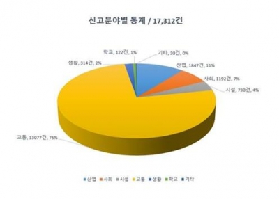 미처리 건은 처리기한 미도래로 현재 처리 중 신고분야별로 보면 교통 분야가 1만 3,077건, 그 중에서 불법주정차가 7,646건으로 가장 큰 비중을 차지하고 있다.