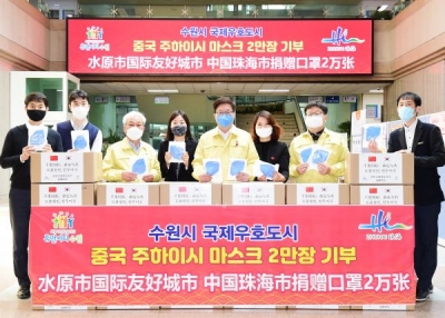 수원시는 6일 시청 본관 로비에서 주하이시가 보낸 보건용 마스크 2만 매를 수령했다.