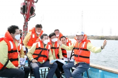 정 시장은 관계 공무원들과 어선을 타고 사업 현장을 둘러보며 민선 7기 공약사항인 ‘오성 강변 르네상스 사업’, ‘안성천변 습지를 활용한 관광자원 개발사업’ 추진 현황과 아이디어를 공유했다.