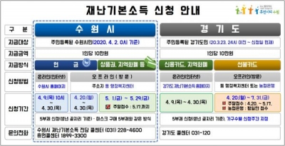 수원시민을 비롯한 모든 경기도민에게 1인당 10만원을 ‘경기도 재난기본소득’은 4월 9일부터 7월 31일까지 신청할 수 있다.