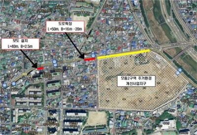 이번 사업은 모충초교 입구 약 50m 구간은 기존 도로 폭 16m→20m로 확장하고 모충주유소 주변 약 40m 구간은 보도를 설치한다.